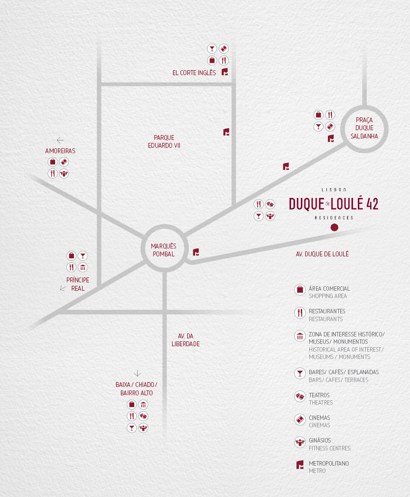 Viver no Duque de Loulé 42 é ter por perto o luxo da Avenida da Liberdade e o dinamismo do Saldanha, com os seus centros comerciais, cinemas, teatros, ginásios e restaurantes, e estar a poucos minutos da Baixa, do Chiado ou do Bairro Alto, onde a Lisboa antiga e acolhedora convive com uma capital fervilhante e cosmopolita.